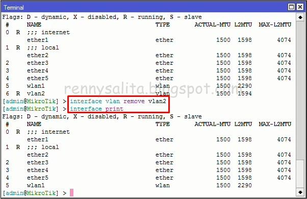 Then the "remove" the VLAN that has been created, by way >remove VLAN interface (VLAN name). Then check the way >interface print